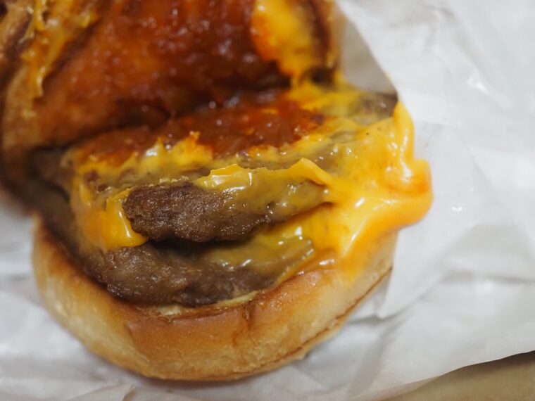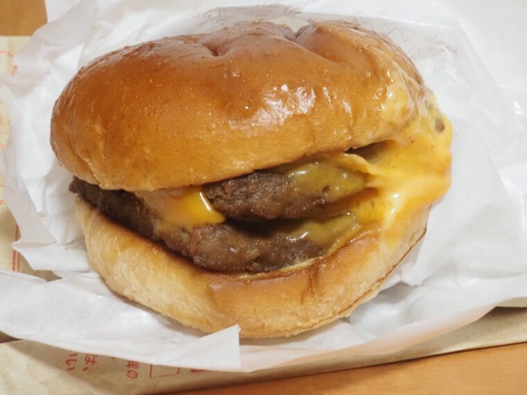 甘みが強めのバンズ、甘酸っぱいソース、パティ2枚にチーズ。