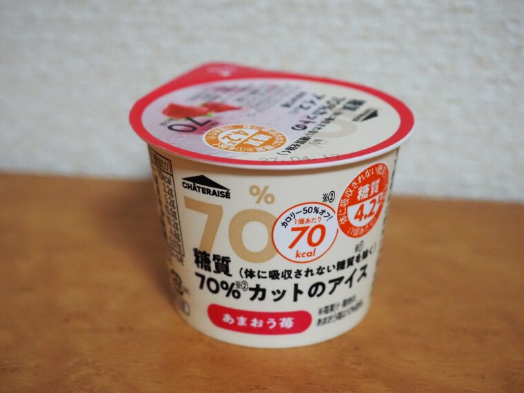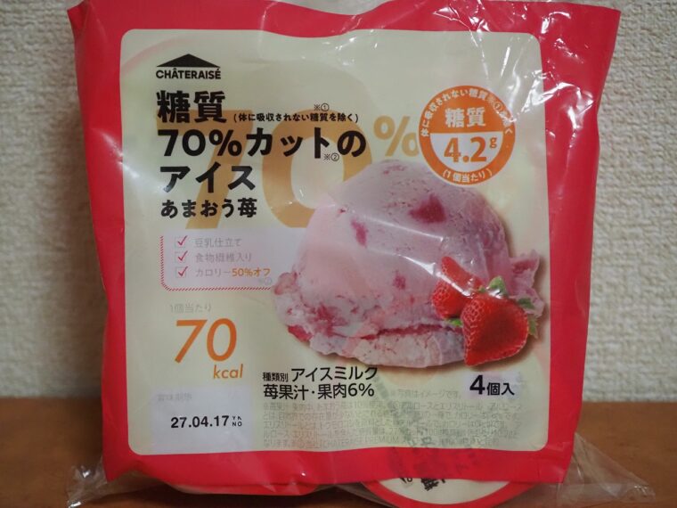 シャトレーゼから販売されている「糖質70%カットのアイス あまおう苺」を食べてみました。