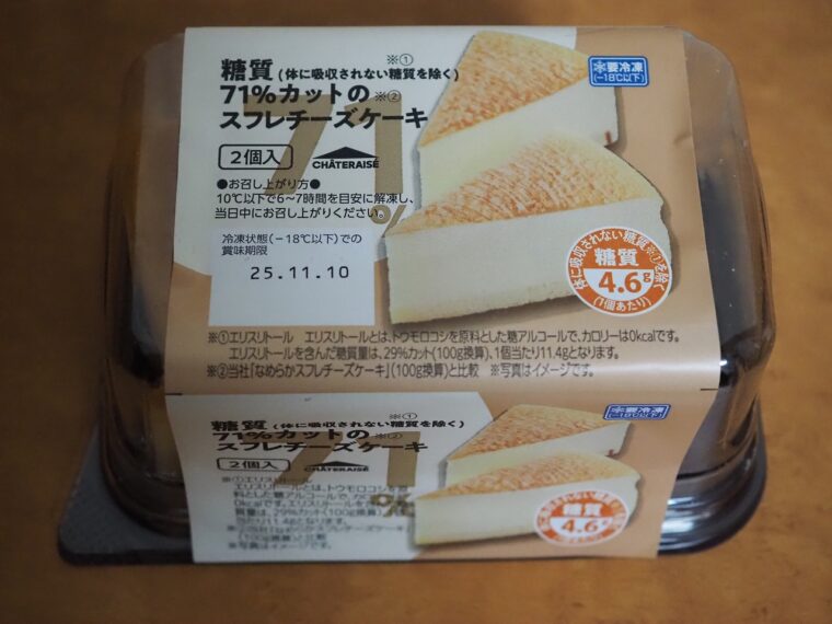 シャトレーゼから販売されている「糖質71%カットのスフレチーズケーキ2個入」を食べてみました。