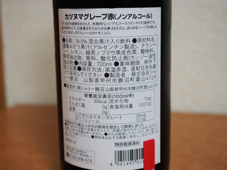 ノンアルコールワインの「シャトー勝沼 カツヌマグレープ 赤」を飲んでみました。