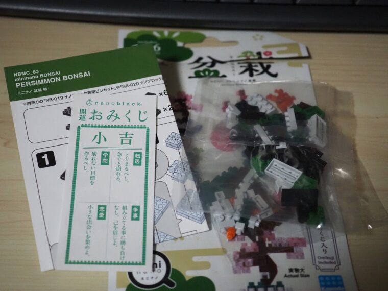 カメラで生き残る【FigureグラビアPart.81】「ナノブロック ミニナノ 盆栽(柿)」【nanoblock】 pearl.been.mellow.xxx 2026年1月9日 ナノブロック、ミニナノシリーズから「盆栽(柿)」の紹介です。 おみくじも付いてくるのですが「小吉」でした。 完成↓ シンプルで良いですね。木の曲がり具合も上手く再現しています。 フィギュアグラビアです。 小さいので飾る場所を選びません。こじんまりとしながらも、日本の秋を感じられる商品です。 リンク リンク リンク リンク リンク